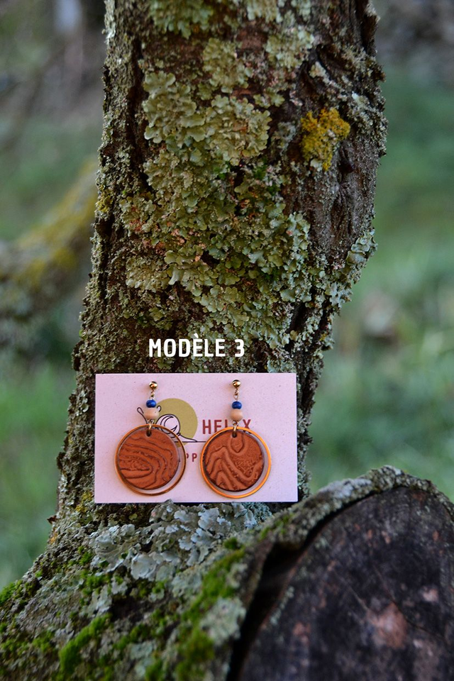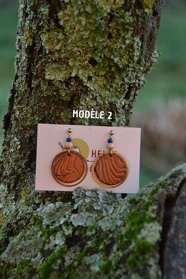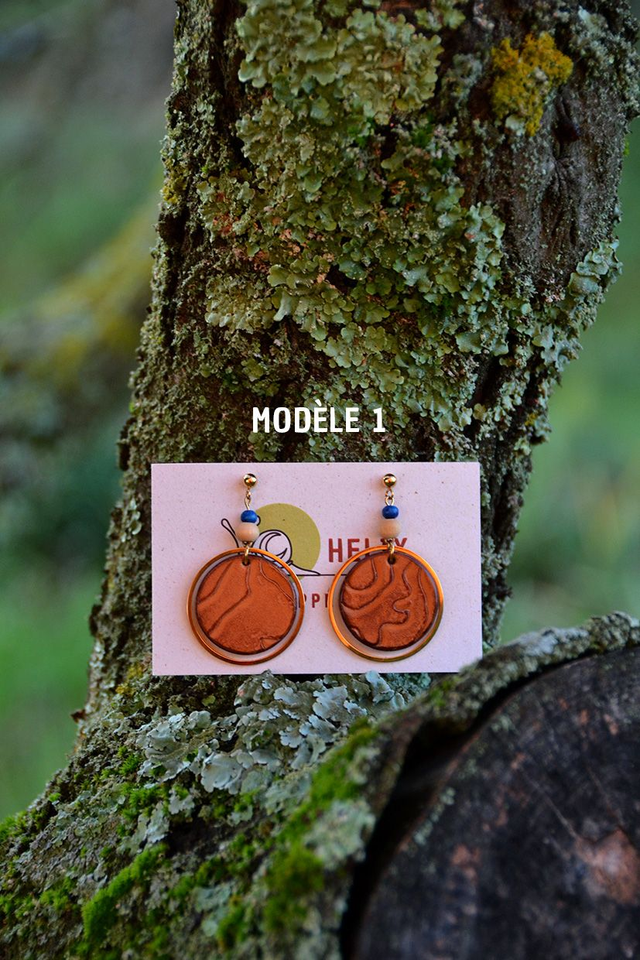 Apporte une pointe d'élégance et d'originalité à tes tenues avec ces boucles d'oreilles en cuir. Des fragments de paysages cerclés d'or surmontés de petites perles en bois. Très légères, elles se balancent au gré des mouvements sans peser sur l'oreille.